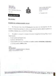 NEWS RELEASE: MURDER OF AHMED HUSEINI- SUALE January 17, 2019 Posted by: GHANA POLICE Category: General Announcements No Comments