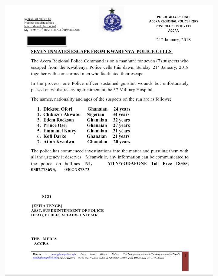 News Release – Seven inmates escape from kwabenya police cells. January 21, 2018 Posted by: GHANA POLICE Category: Press Release No Comments News Release – Seven inmates escape from kwabenya police cells.