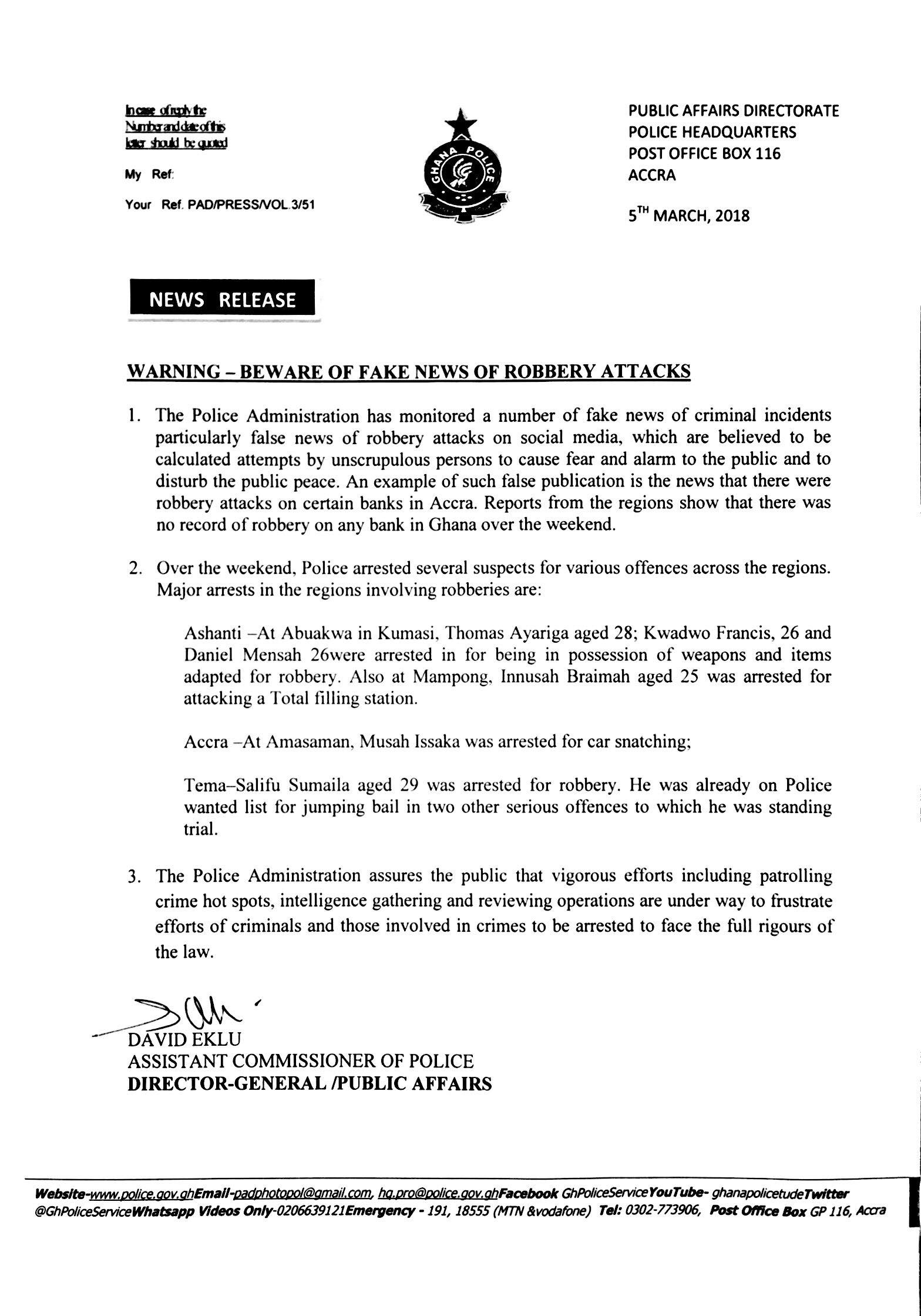 Press Release: Warning – Beware of fake news of robbery attacks March 5, 2018 Posted by: GHANA POLICE Categories: General Announcements, News No Comments