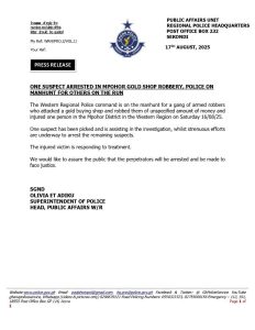 ONE SUSPECT ARRESTED IN MPOHOR GOLD SHOP ROBBERY, POLICE ON MANHUNT FOR OTHERS ON THE RUN