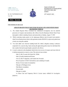 ASHANTI REGION POLICE RECOVER WEAPONS AND AMMUNITION FROM ABANDONED VEHICLES