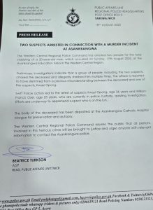 TWO SUSPECTS ARRESTED IN CONNECTION WITH MURDER INCIDENT AT ASANKRANGWA