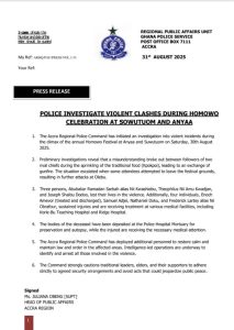 POLICE INVESTIGATE VIOLENT CLASHES DURING HOMOWO CELEBRATION AT SOWUTUOM AND ANYAA
