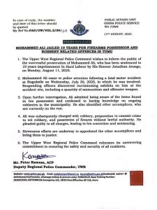 МОНАMMED ALI JAILED 10 YEARS FOR FIREARMS POSSESSION AND ROBBERY-RELATED OFFENCES IN TUMU.