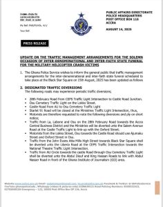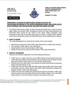 TEMPORARY CLOSURE OF SOME PUBLIC ROADS IN ACCRA ON THE SOLEMN OCCASION OF THE INTER-DENOMINATIONAL AND INTER-FAITH STATE FUNERAL FOR THE MILITARY HELICOPTER CRASH VICTIMS