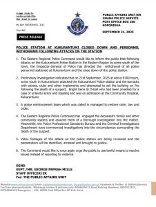 POLICE STATION AT KUKURANTUMI CLOSED DOWN AND PERSONNEL WITHDRAWN FOLLOWING ATTACKS ON THE STATION