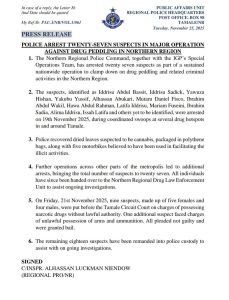 POLICE ARREST TWENTY-SEVEN SUSPECTS IN MAJOR OPERATION AGAINST DRUG PEDDLING IN THE NORTHERN REGION