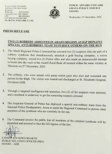 TWO (2) ROBBERS ARRESTED IN AHAFO REGION AS IGP DEPLOYS SPECIAL ANTI-ROBBERY TEAM TO PURSUE OTHERS ON THE RUN