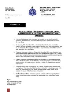 POLICE ARREST TWO SUSPECTS FOR UNLAWFUL POSSESSION OF A FIREARM AND AMMUNITION AT KANESHIE