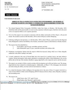 POLICE ARREST TWO SUSPECTS IN CONNECTION WITH MURDER AND ROBBERY AT ADUMAN