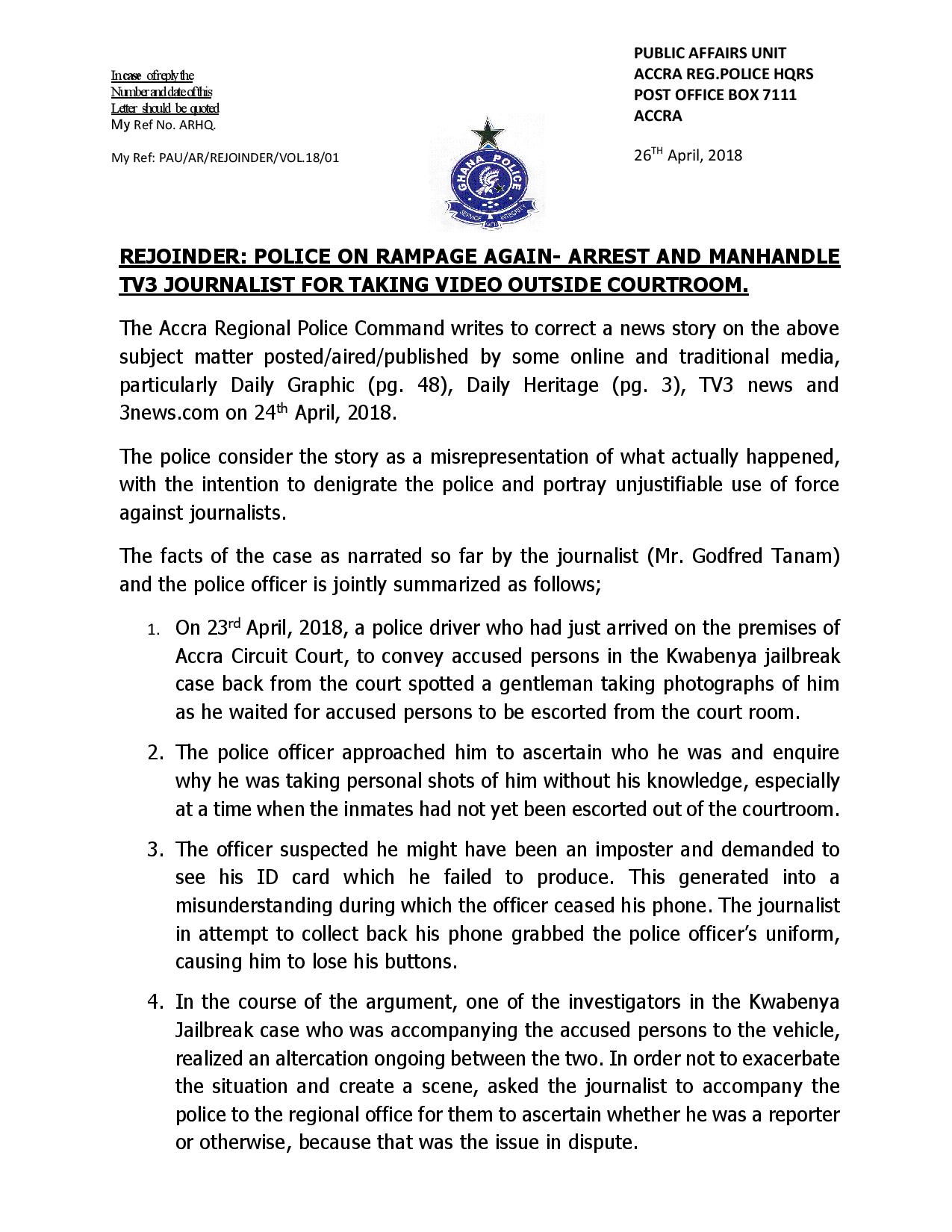 Rejoinder: Police on Rampage Again – Arrest & Manhandle TV3 Journalist for taking video outside Courtroom April 27, 2018 Posted by: GHANA POLICE Category: General Announcements No Comments